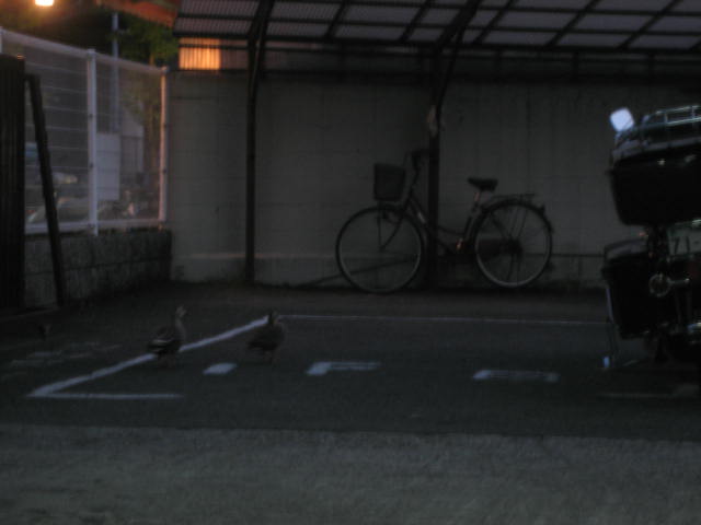 振り返ると鴨の親子がピット前の軒下を裏の川から歩いて来た・・・