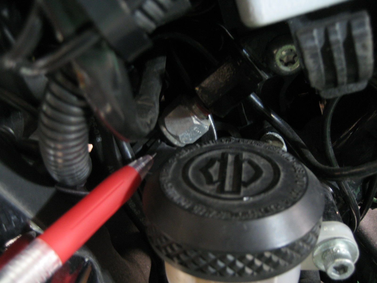 サイドカバーの下でリザーバータンクの奥あたりでございます。